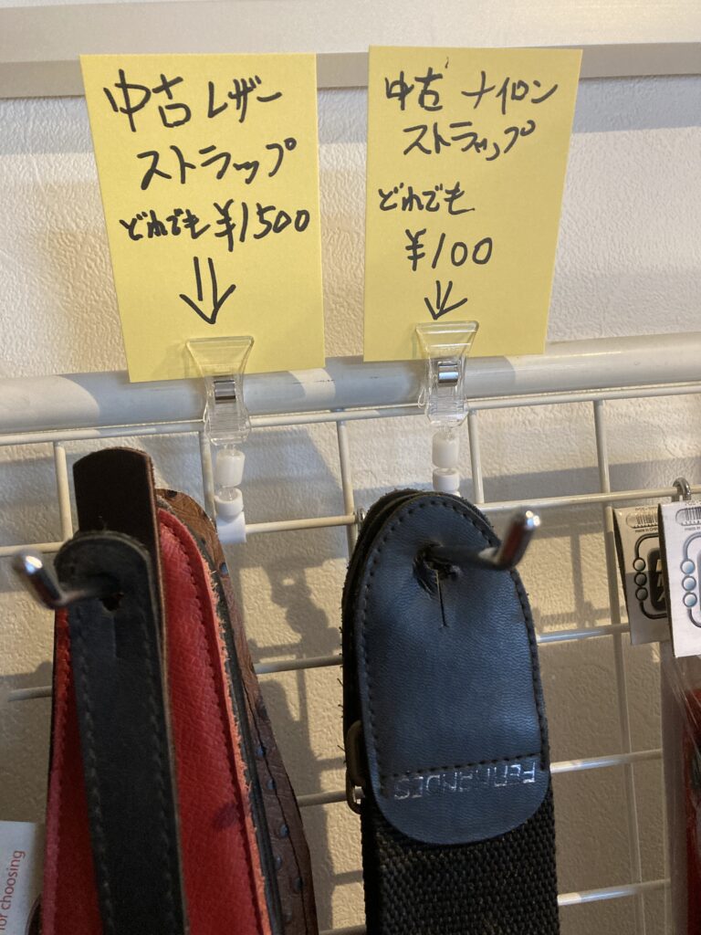中古のギターストラップ、ナイロン製のものは1本100円、レザー製は1本1500円です。