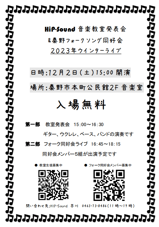 音楽教室発表会 2023年11月24日2023年11月24日 totorou12月2日(土)15時より本町公民館で教室発表会を開催します。入場無料です。観覧ご希望の方は予約不要です。開演10分前までにご入場ください。
